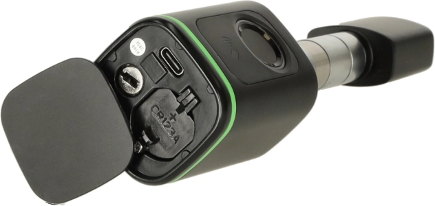 La construction robuste en aluminium et laiton est conçue pour une utilisation en intérieur (IP50). Alimenté par une pile CR123A, il n’exige aucun câble – en cas de batterie faible, il suffit de la remplacer. Une clé mécanique classique sert de secours pour garantir l’accès en cas d’urgence.