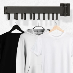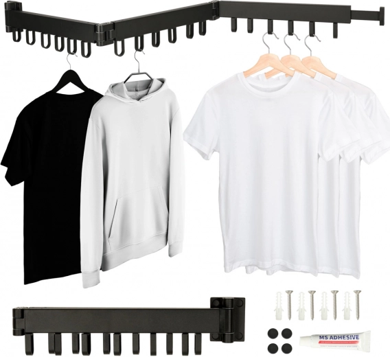 Élégant sèche-linge mural en noir mat, adapté aux petits comme aux grands espaces. Grâce à ses quatre bras rabattables à angle réglable et extension télescopique, vous adaptez facilement la surface de séchage selon vos besoins. La construction stable en aluminium résistant assure une longue durée de vie à la maison comme sur le balcon.