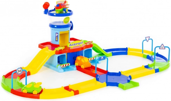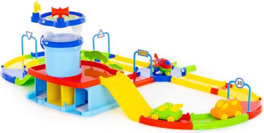 Un système de voies multicolores avec ponts, tunnels et connexions pour véhicules et avions assure une circulation fluide et de nombreux scénarios de jeu.