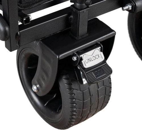 Des roues à bande de roulement en matériau PP garantissent une progression fluide sur le sable, l’herbe et le gravier. Les roues avant pivotent à 360° et deux roues sont équipées d’un frein pour un stationnement sécurisé.
