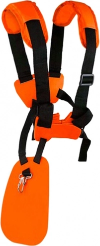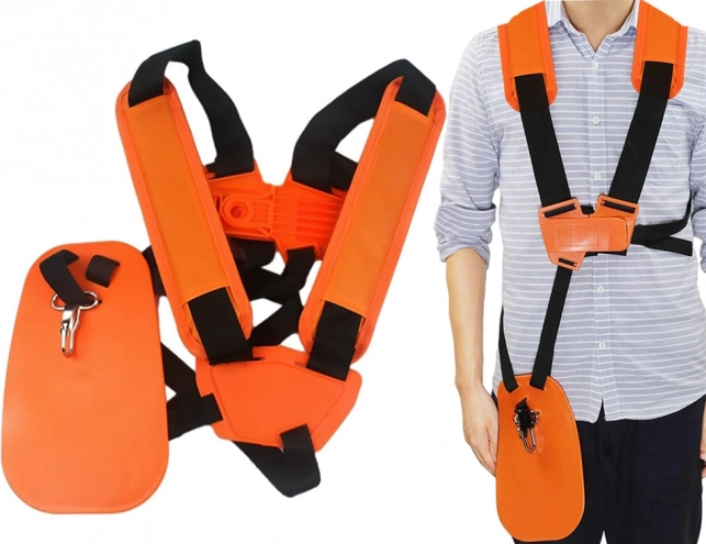 Le harnais est compatible avec la plupart des débroussailleuses à essence, électriques et à batterie, offrant un soutien exceptionnel et une excellente visibilité grâce à sa couleur orange vif.