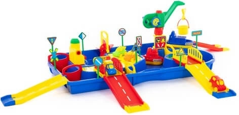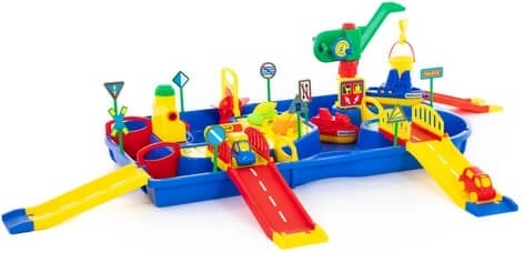 Le set est conçu pour jouer en extérieur – il est parfait pour le jardin, le bac à sable ou près de la piscine. Des pièces en plastique de qualité, des couleurs attrayantes et des éléments interactifs favorisent la concentration et les compétences motrices. Les canaux avec moulin et grue de port offrent des situations réalistes que les enfants aiment explorer encore et encore.