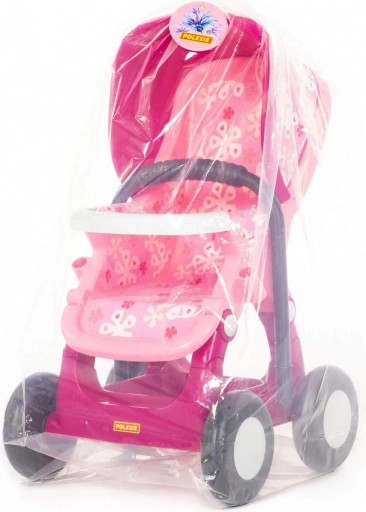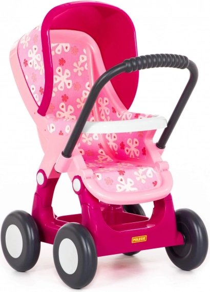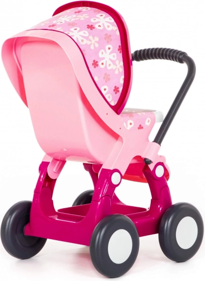 La finition rose avec un imprimé marqué et de grandes roues confère à la poussette une allure attrayante et une bonne stabilité.