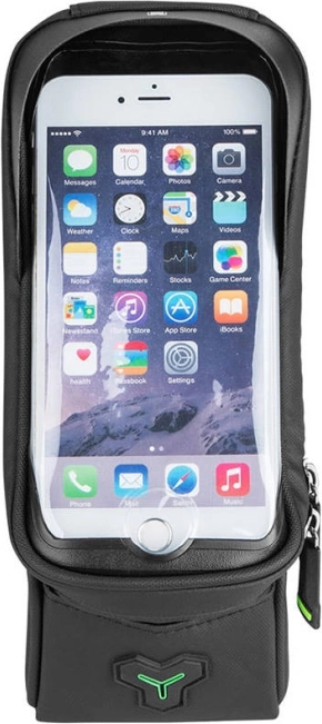 L’intérieur offre suffisamment de place pour des clés, une lampe, un couteau de poche et d’autres petits objets. La sacoche est fabriquée en nylon 900D résistant, combiné avec du velours pour une meilleure protection du téléphone et des accessoires. Le montage sur le tube supérieur du cadre est rapide et stable.