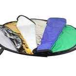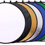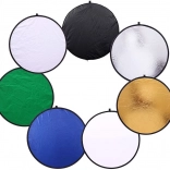 Kit universel pour travailler la lumière : réflecteur photo pliable 7 en 1 de 60 cm de diamètre avec diffuseur intégré. Il offre sept surfaces — dorée, argentée, blanche, noire, bleue, verte et diffusante — pour un contrôle parfait des reflets, de la température et de l’uniformité de la lumière, en studio comme en extérieur. Léger, compact et robuste – idéal pour les professionnels comme pour les débutants.