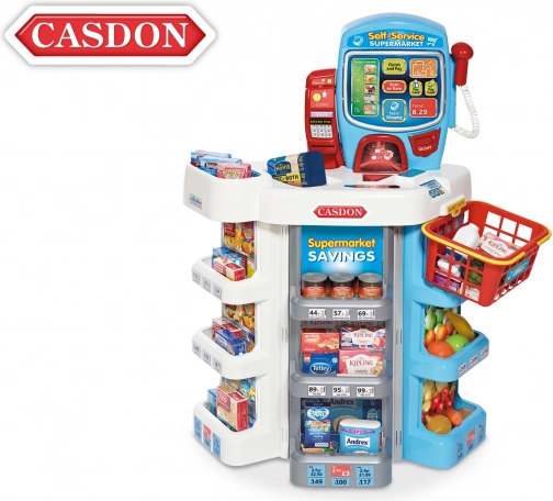 La caisse libre-service Casdon pour enfants, au design soigné, transforme le jeu de magasin en une véritable expérience : elle offre des sons réalistes, un écran tactile et un afficheur électronique. Elle comprend un terminal chip and PIN, un scanner, des billets et des pièces, des répliques d'aliments et un panier de courses. Hauteur 75 cm, adaptée dès 3 ans.