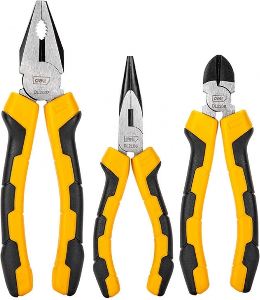Pratique set de pinces DELI pour un usage quotidien, comprenant les trois types les plus utilisés : pince universelle combinée 8", pince à bec long 6" et pince coupante diagonale 6". Fabriquées en acier à haute teneur en carbone pour une longue durée de vie, elles offrent des poignées ergonomiques et une prise fiable pour un travail précis et confortable.