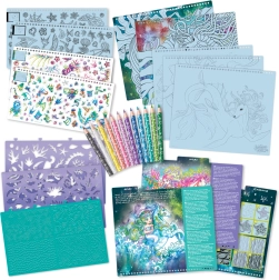 - 250 autocollants, 12 crayons de couleur, 80 pochoirs, 35 feuilles illustrées, 4 moules en plastique, instructions pour 12 techniques de dessin