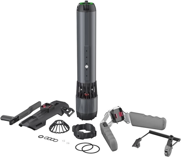 Grâce au système de montage rapide, le scooter se prépare en un clin d’œil. Une variété d’adaptateurs est disponible pour différents modes de fixation. Doté d’un carter en aluminium, il atteint une vitesse allant jusqu’à 1,4 m/s et permet une immersion jusqu’à 60 m.