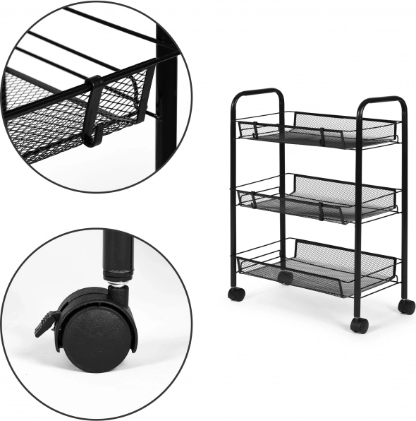 Grâce aux roulettes pivotantes, l’étagère se déplace facilement là où elle est nécessaire. Deux freins de blocage assurent un maintien sûr sans déplacement involontaire. Quatre crochets pratiques étendent l’espace de rangement pour torchons, éponges, ustensiles ou sacs.