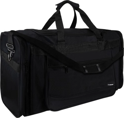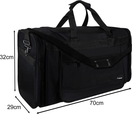 L’organisation est simple : la chambre principale accueille vêtements et équipement, la poche avant zippée est idéale pour les petits objets et documents, et les deux grandes poches latérales offrent un accès rapide aux chaussures ou accessoires. La bandoulière réglable avec coussinet ménage votre épaule même avec une charge plus lourde.