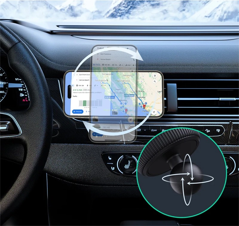 Le montage sur la grille d’aération est rapide et sûr, la rotule offre une rotation à 360° et une inclinaison de 30° pour un angle de vue optimal – vous passez facilement du portrait au paysage. L’interface intégrée USB‑C assure un apport d’énergie stable et des performances fiables.