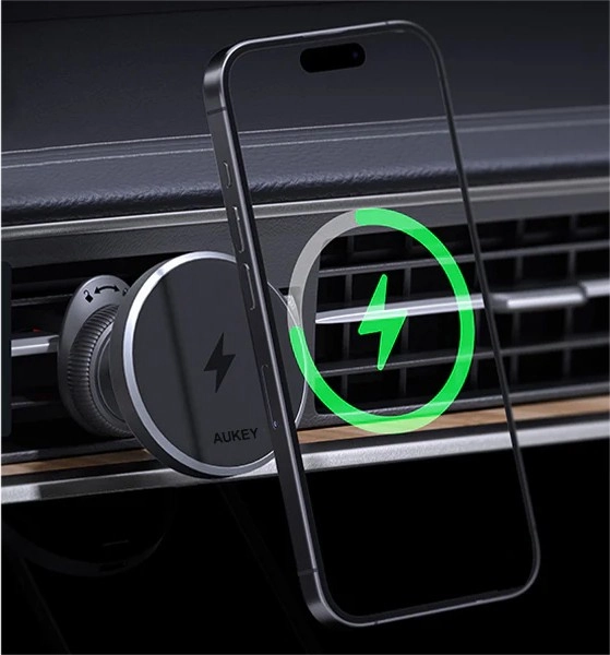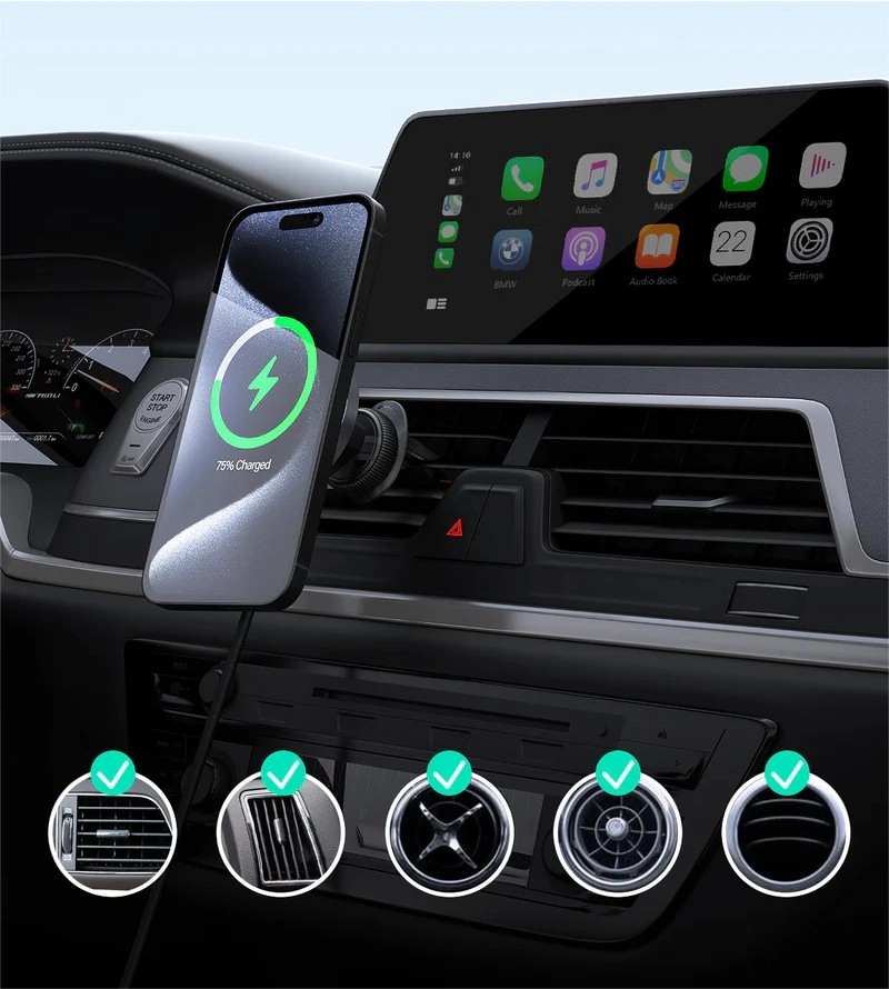 Les aimants maintiennent le téléphone stable même sur routes dégradées, tandis que la norme Qi2 délivre jusqu’à 15 W pour une charge sans fil rapide et efficace.