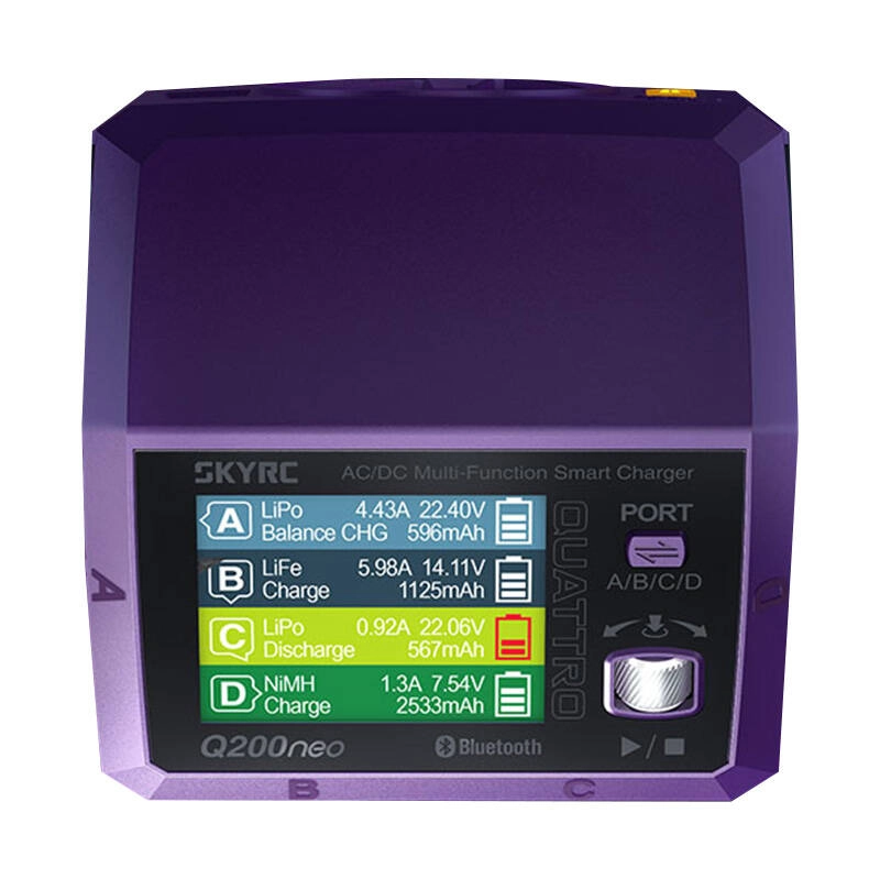 Le SKYRC Q200neo accélère votre préparation de vol ou de course : en mode AC, il délivre jusqu’à 200 W et en DC jusqu’à 400 W, avec jusqu’à 100 W par port. Avec deux ports depuis l’AC, il concentre la puissance au maximum ; avec quatre ports, il la répartit dynamiquement selon les besoins. Le refroidissement actif et la gestion avancée de charge (MCU, PID) maintiennent température et courant sous contrôle.