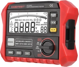 Le testeur de résistance de terre Habotest HT2302 est équipé d'un grand écran LCD pour lire facilement les valeurs affichées. Il permet des mesures allant de 0a9 à 4,00ka9 avec précision et efficacité en mode deux ou trois pôles. L'appareil est adapté pour vérifier la résistance de terre et la sécurité électrique.
