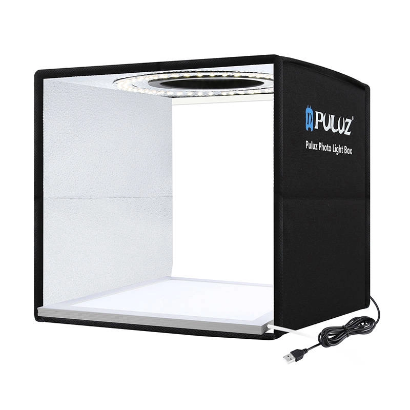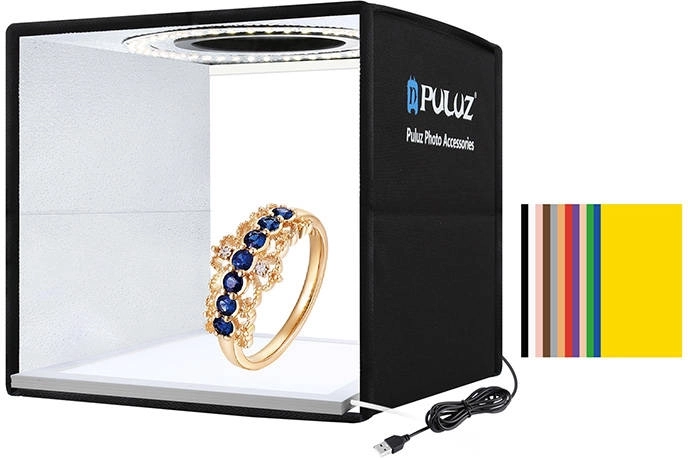 Mini studio photo compact PULUZ de 25 × 25 × 25 cm avec anneau lumineux 96 LED (type 2835) et un indice de rendu des couleurs élevé CRI >95 pour une photographie produit de pointe sans ombres. Il offre un variation continue de 1 à 100 %, une température de couleur de 5 500 K et une alimentation USB. La construction pliable, la prise de vue par le haut et en façade ainsi que 6 arrière-plans double face vous aident à obtenir des résultats parfaits partout.