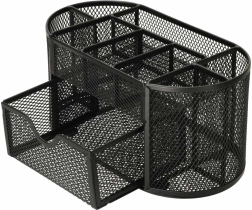 Cet organiseur de bureau pratique en maille métallique résistante vous aide à garder tout à portée de main et à sa place. Neuf compartiments intelligemment répartis accueillent crayons, ciseaux, règles, trombones et blocs adhésifs, tandis que le tiroir coulissant est idéal pour les petits objets et les fiches mémo. Grâce à sa conception ouverte, vous gardez toujours une parfaite vue d’ensemble sur le contenu.