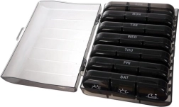 Répartition pratique en jours de la semaine : À l'intérieur, vous trouverez sept compartiments séparés, chacun marqué de lettres blanches pour facilement identifier les jours de la semaine. Chaque compartiment est individuellement amovible pour un transport facile.