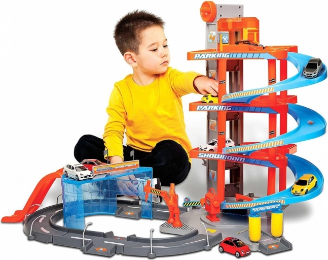 Ce garage Bburago à plusieurs étages avec station de lavage cache de nombreux éléments fonctionnels ! Monte la petite voiture en ascenseur jusqu’au dernier étage du garage et fais-la dévaler la route ! Arrête-toi au service, lave la voiture à la station de lavage et passe sous les barrières levantes !