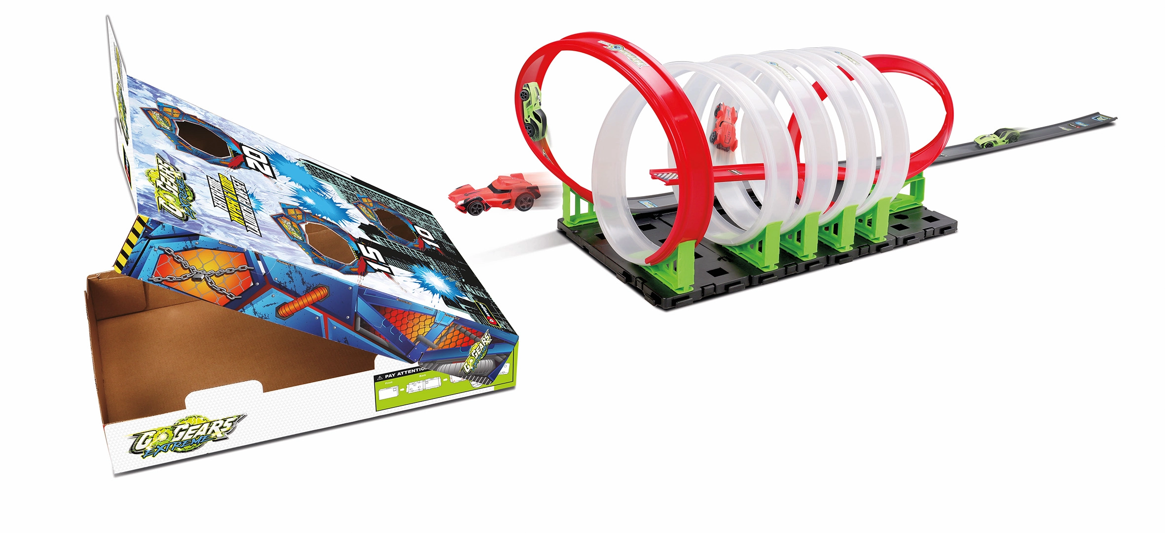 Vivez une course pleine d’adrénaline avec le circuit Bburago GoGears Extreme ! Le système avec 6 loopings, une rampe de saut et 2 voitures ultra-rapides offre une action qui ravira petits et grands pilotes. Avec une seule traction, la voiture parcourt jusqu’à 25 m et le cible en carton avec zones de points garantit encore plus de fun.