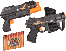 Ensemble ludique de deux blasters à fléchettes en mousse pour des jeux d’action en intérieur comme en extérieur. Comprend le pistolet Auto Scout avec un chargeur de 6 fléchettes et le pistolet Echo‑1 à rechargement par pompe. Le coffret inclut 16 fléchettes en mousse, une portée jusqu’à 15,2 m et une détente facile pour un amusement sûr et rapide.