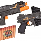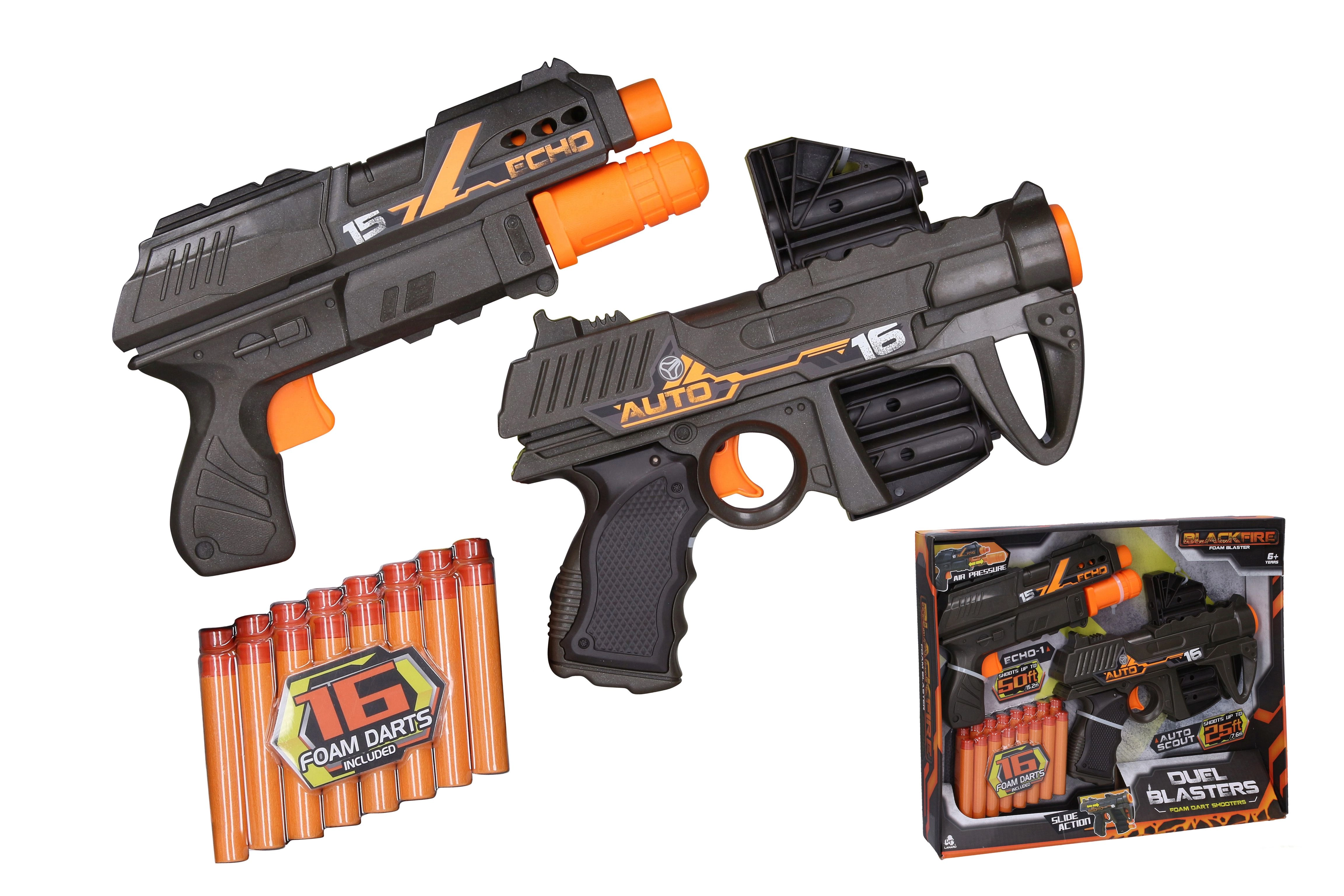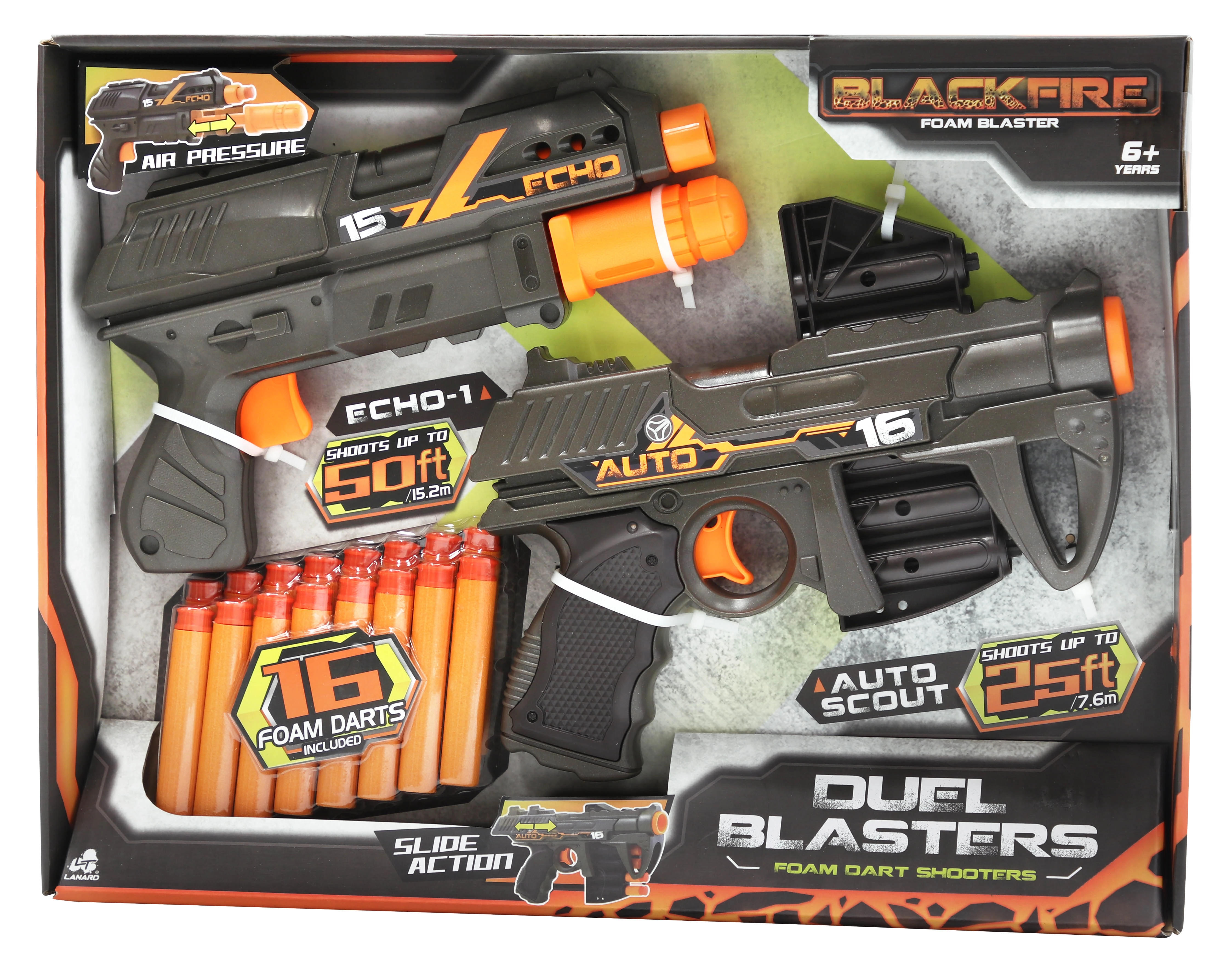 Profitez de duels pleins d’adrénaline avec cette paire de pistolets à fléchettes en mousse BLACKFIRE. Le modèle Auto Scout offre un tir rapide grâce à son chargeur de 6 fléchettes et à son armement du canon avant chaque tir. L’Echo‑1 séduit par son rechargement par pompe avec insertion de la fléchette directement dans le canon et une portée plus longue jusqu’à 15,2 m.