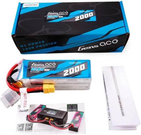 Batterie LiPo haute tension performante et légère Gens Ace 2000 mAh 22,8 V 60C 6S avec connecteur XT60 pour avions RC, voitures et hélicoptères. Elle offre une puissance stable, un courant de décharge élevé de 60C (jusqu’à 90C en pointe) et un poids réduit de 297 g pour un excellent rapport puissance/poids.