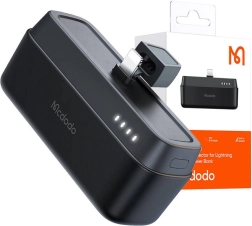 Un port USB‑C est présent pour la recharge rapide de la batterie externe (entrée jusqu’à 18 W), la rendant à nouveau prête en moins de 2 heures. Le support pliable permet de regarder confortablement des vidéos ou de passer des appels vidéo pendant la charge. Les indicateurs LED affichent le niveau de batterie et le mode de charge rapide actif, et un capuchon protège le connecteur Lightning de la poussière.