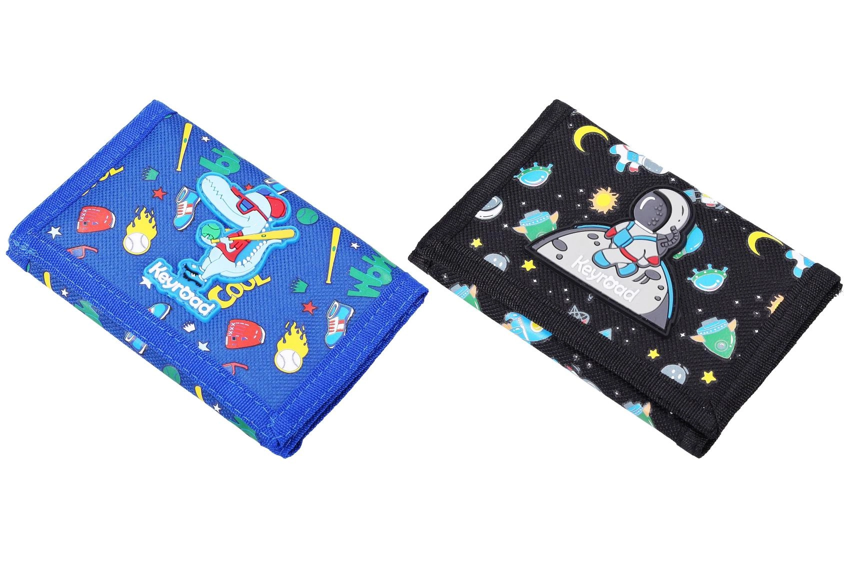 Pratique portefeuille en tissu avec fermeture Velcro au format compact 12,5 × 8 cm, idéal pour les enfants et les écoliers. Disponible en 2 motifs attrayants – bleu avec dinosaure et noir avec astronaute. Léger, résistant et facile à glisser dans une poche ou un cartable.