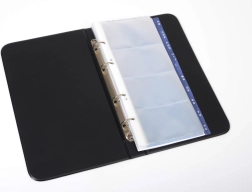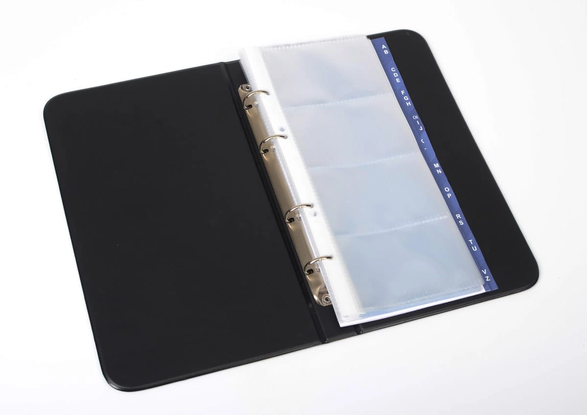Porte-cartes apprécié avec mécanisme à anneaux et feuilles intérieures pour jusqu’à 80 cartes de visite. Complété par un index A-Z.