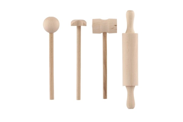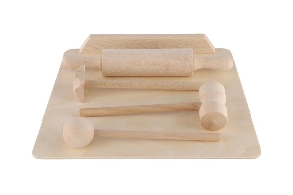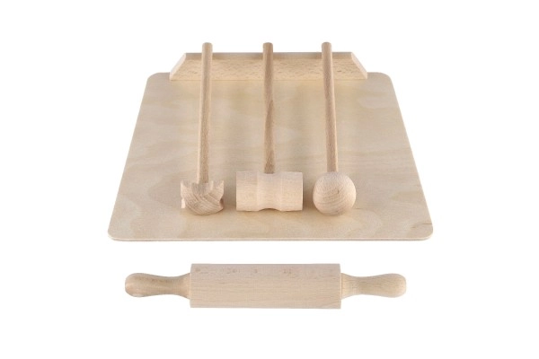 La planche, le rouleau et le maillet ressemblent à de véritables accessoires de cuisine. Ils favorisent le jeu d’imitation et le développement des compétences sociales.
