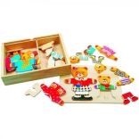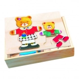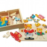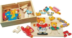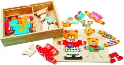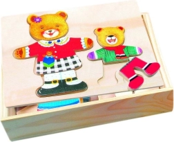 Puzzle d'habillage en bois de Bino offre amusement et éducation dans un emballage pratique. Les enfants peuvent placer les pièces dans le couvercle de la boîte et créer différentes tenues pour les ours selon leur imagination.