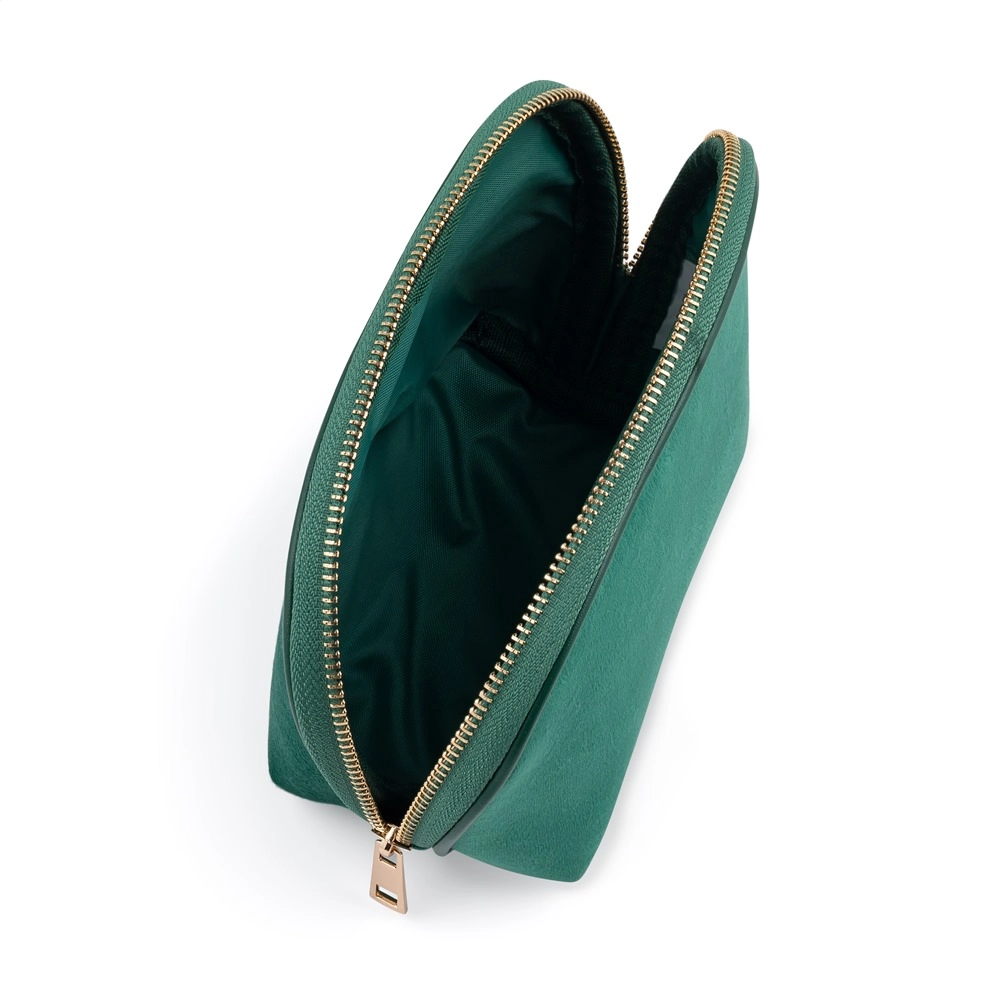 Pratique trousse de toilette de voyage de forme ronde, dans une élégante finition verte, idéale pour ranger de petits articles de toilette et de beauté. Grâce à ses dimensions compactes 15,5 × 14 × 7,5 cm, tout reste bien organisé et à portée de main à la maison comme en déplacement.