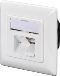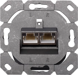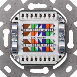 La prise dispose de deux ports RJ45 de type 8P8C, ce qui permet une connexion simple et flexible aux équipements réseau. Le raccordement LSA+ codé par couleurs selon la norme EIA/TIA 568B facilite l’orientation lors de l’installation du câblage.