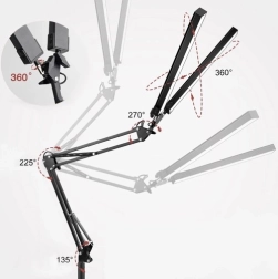 Le bras réglable permet une rotation dans plusieurs plans (360 / 225 / 270 / 135 degrés), augmentant ainsi la flexibilité d'utilisation. Elle peut être montée à l'aide d'une pince ou d'un support, assurant une utilisation universelle dans différents environnements, que ce soit à la maison ou au bureau.