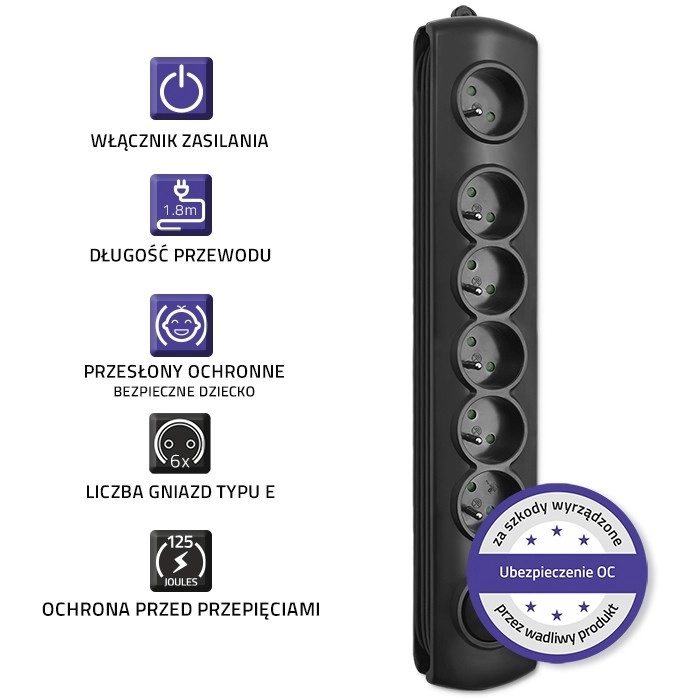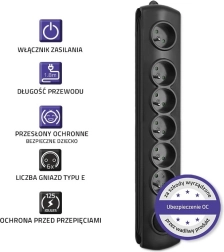 La sécurité est assurée par une protection contre les surtensions avec varistance, des protections enfants intégrées sur toutes les prises et un matériau PP ignifuge. Grâce à la possibilité de montage sur le mobilier et à la solution de bobinage du câble excédentaire, vous gardez les câbles sous contrôle et l’espace reste propre et ordonné.