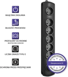 L’interrupteur au pied lumineux Quick Switch permet d’activer ou couper l’alimentation facilement et rapidement sans se pencher – l’indicateur lumineux montre clairement quand les appareils connectés sont sous tension. Votre sécurité est assurée par la protection contre les surtensions avec varistance, les sécurités enfants sur toutes les prises et le PP ignifuge du boîtier. Le fabricant se réserve le droit de modifier les paramètres techniques.