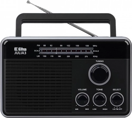 Le récepteur radio compact Julia 3 en élégant coloris noir offre une grande échelle facilement lisible, un réglage confortable et une régulation fluide du volume. Il comprend également le réglage de la tonalité, une sortie casque, une antenne télescopique orientable et une alimentation double secteur et piles pour une écoute à la maison comme en déplacement.
