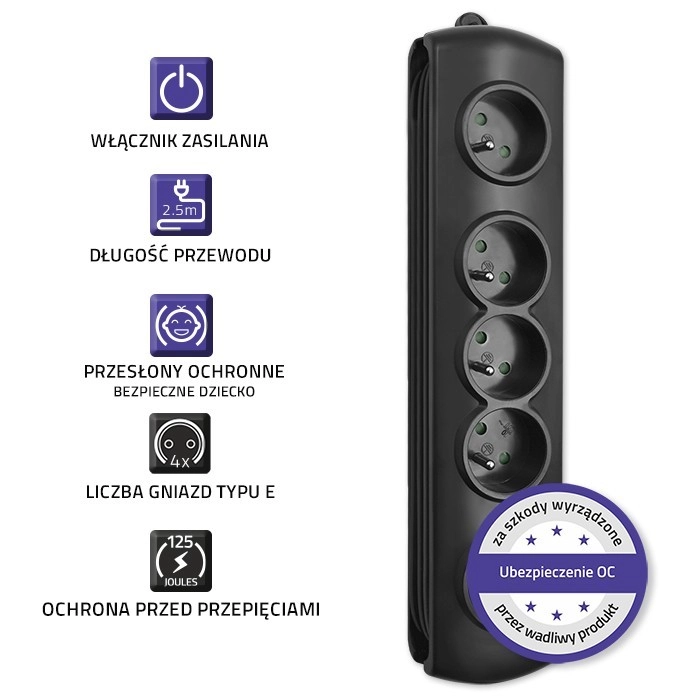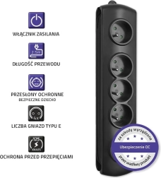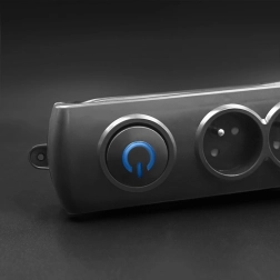 L’utilisation est ultra pratique grâce à l’interrupteur au pied rétroéclairé Quick Switch – d’une simple pression, vous coupez ou rétablissez l’alimentation de tous les appareils connectés. La sécurité est assurée par les éléments de protection contre les surtensions (varistance), les obturateurs de sécurité enfants sur toutes les prises et la conception en PP ignifuge.