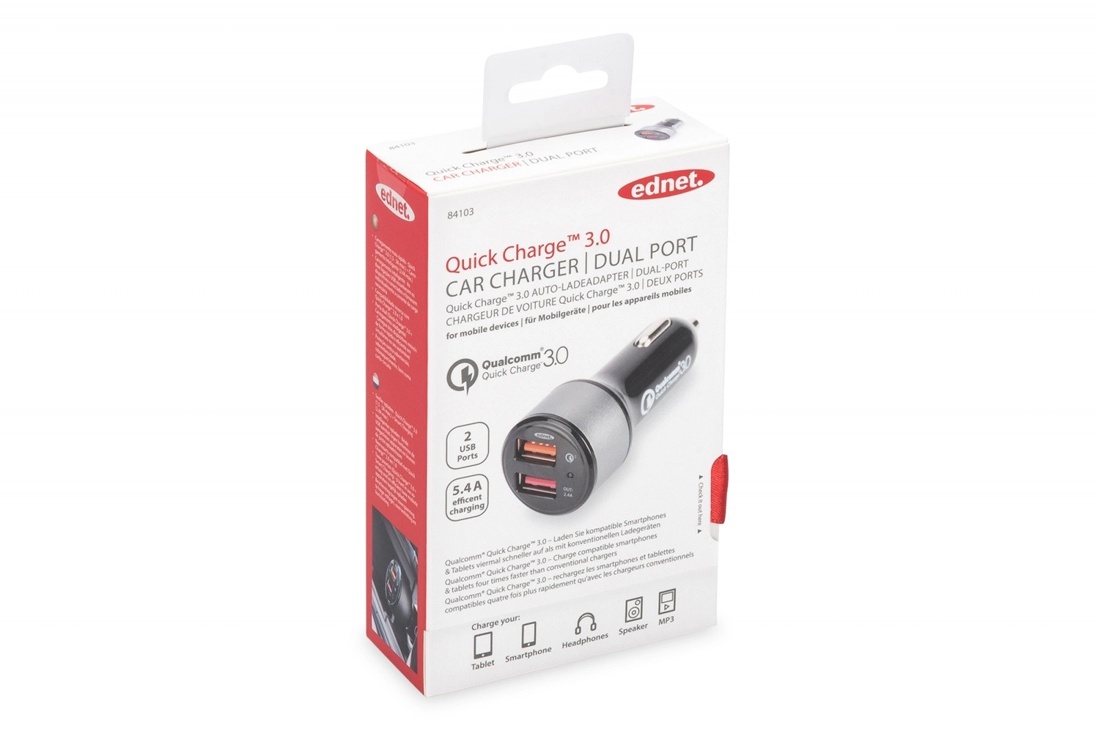 Profitez d’une recharge éclair en déplacement grâce à la technologie Qualcomm Quick Charge 3.0, qui charge les appareils compatibles jusqu’à quatre fois plus vite et jusqu’à 38 % plus rapidement que QC 2.0. Le deuxième port avec smart charging (2,4 A) s’adapte intelligemment à chaque appareil pour une vitesse et une sécurité maximales.