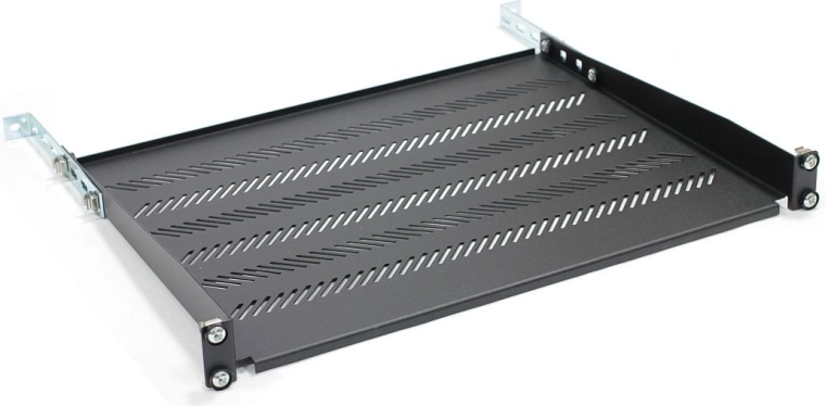 Étagère universelle 1U pour baie 19" avec une profondeur de 350 mm offrant un support stable pour les appareils sans équerres de montage, tels que des ordinateurs de bureau ou de la documentation. Construction en acier robuste avec perforations pour un meilleur flux d’air garantissant stabilité et refroidissement, tandis que la réglabilité et le support permettent un positionnement précis dans le châssis.