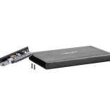 Boîtier externe compact pour HDD/SSD 2,5" avec interface SATA et connexion rapide USB 3.0 (jusqu'à 5 Gb/s). Le corps en aluminium assure une grande résistance et une dissipation thermique efficace, tandis que la fonction Plug & Play et l'alimentation directe par USB permettent une utilisation facile sans adaptateur externe. Le témoin LED indique l'alimentation et l'activité.