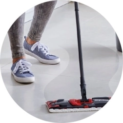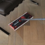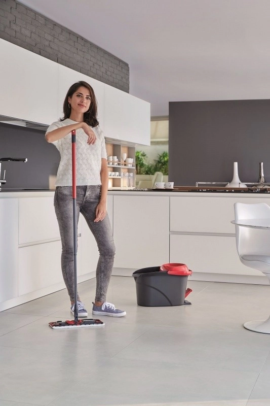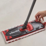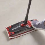 La housse en microfibre 100 % combine deux types de fibres pour une efficacité maximale – les fibres blanches micro-actives capturent la poussière fine et les graisses, tandis que les fibres rouges Vileda ramassent rapidement les saletés et miettes individuelles. L’articulation 180° et le profil bas atteignent facilement les zones sous les meubles et les endroits difficiles d’accès.