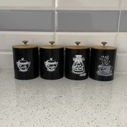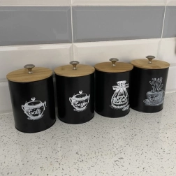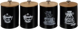 L'ensemble comprend quatre bocaux marqués pour 'Sel', 'Sucre', 'Thé' et 'Café', ce qui aide à garder leur contenu organisé et facilement accessible. Grâce à la poignée en métal sur le couvercle, l'ouverture et la fermeture des bocaux sont simples et pratiques.