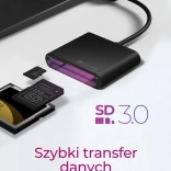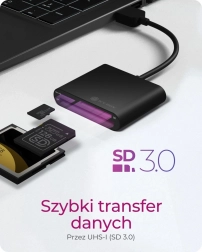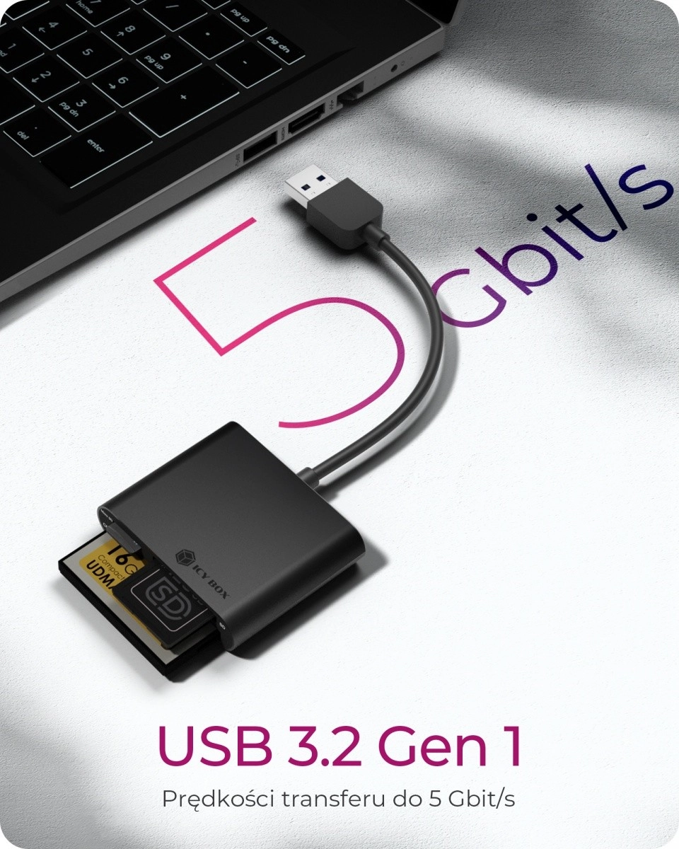 Lecteur de cartes mémoire compact IB‑CR301‑U3 avec interface USB 3.0 offrant une lecture et écriture rapides sur différents types de cartes. Grâce à un débit allant jusqu’à 5 Gbit/s, copiez aisément et rapidement photos, vidéos et documents entre la carte et l’ordinateur.