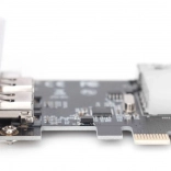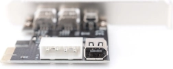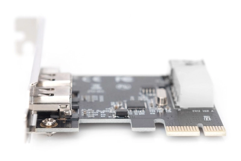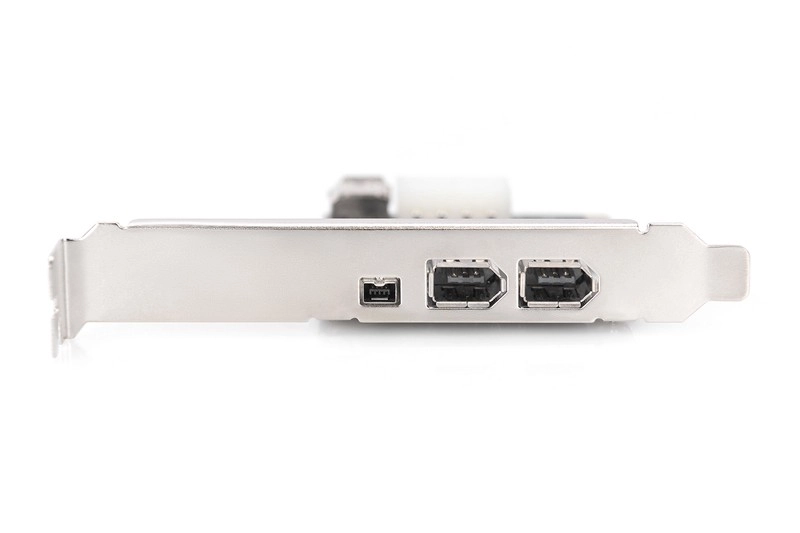 Deux ports externes permettent de brancher immédiatement vos périphériques, tandis que le connecteur interne sert pour un panneau avant ou un périphérique FireWire interne. Le connecteur d’alimentation intégré 4 broches fournit une puissance supplémentaire aux ports pour les périphériques exigeants.