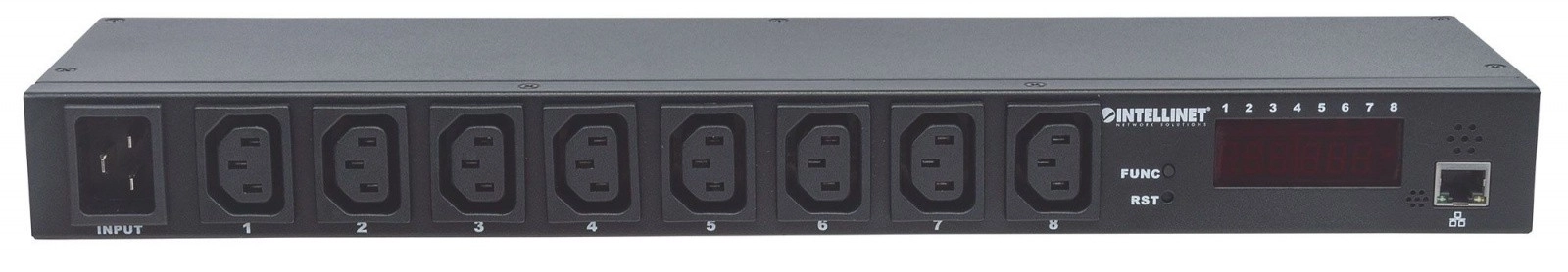 PDU rack professionnelle au format 1U pour châssis 19" offrant 8 prises C13, une plage d’entrée de 110–250 V et un courant de 16 A. Grâce à la gestion réseau (IP), elle permet la surveillance et le contrôle à distance des sorties, y compris le suivi de la consommation d’énergie, de la température et de l’humidité.
