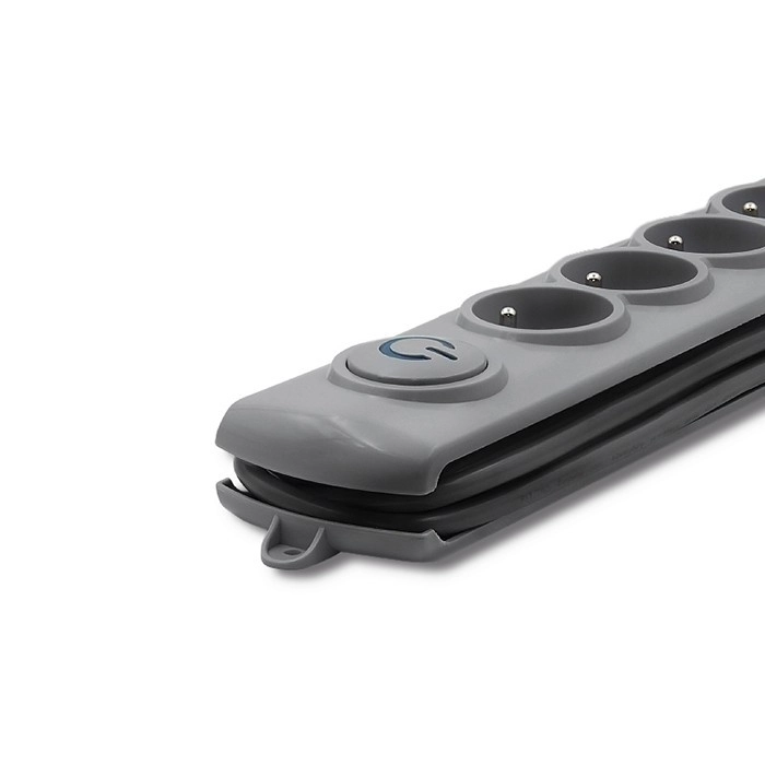 La finition grise s’intègre à tout intérieur. La multiprise permet d’enrouler l’excédent de câble et peut être fixée au mobilier pour une meilleure organisation.