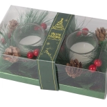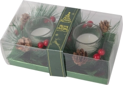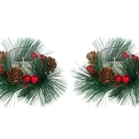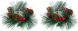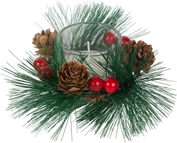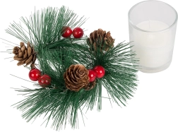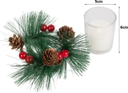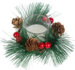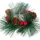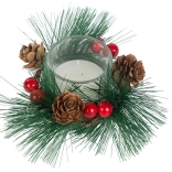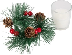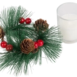Ces bougies décoratives au style de couronne de Noël sont le complément parfait pour votre table de fête ou votre étagère. Branches de pin, pommes de pin et baies rouges autour du photophore en verre ajoutent une touche de charme naturel de Noël.