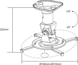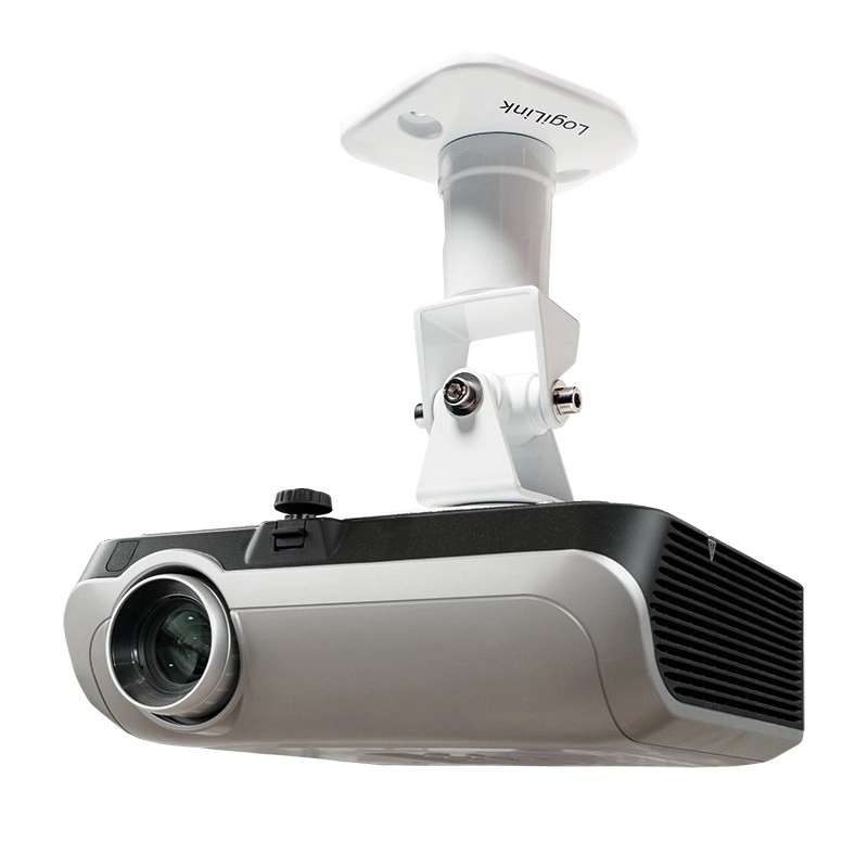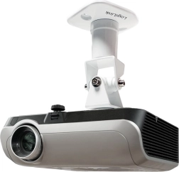 Support plafond universel pour projecteur, coloris blanc, pour une installation sûre sur plafond plat. Supporte jusqu’à 15 kg, offre une inclinaison ±25°, rotation à 360° et des bras métalliques réglables pour un entraxe de 180–310 mm. La pièce moulée en aluminium garantit robustesse et longévité, et le matériel de montage est inclus.